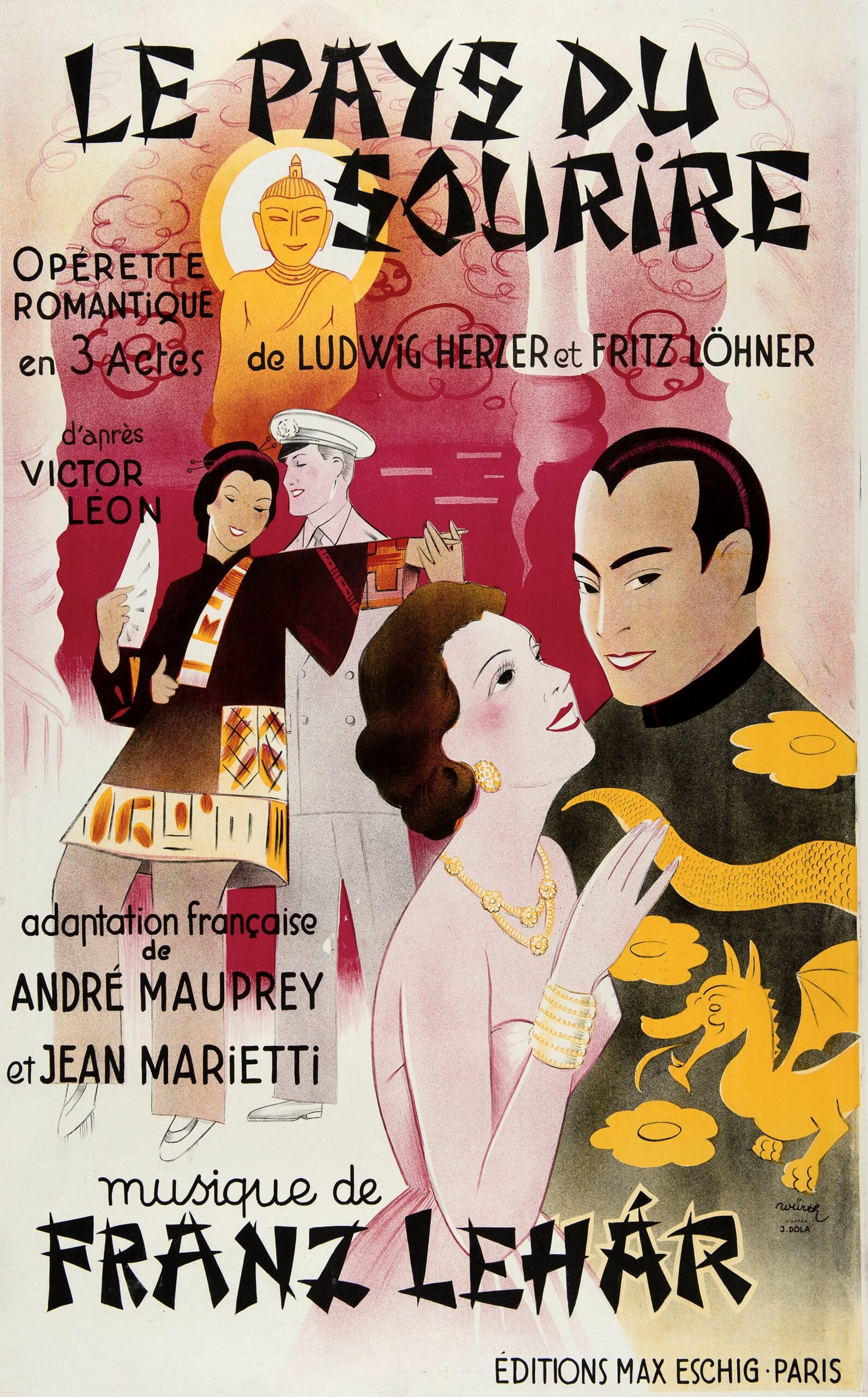 Cette affiche, réalisée par Georges Dola, auteur de nombreuses lithographies d’opéra, d’opéra-comique et d’opérette, présente une opérette romantique « Le Pays du sourire » de Franz Lehár (1870-1948).