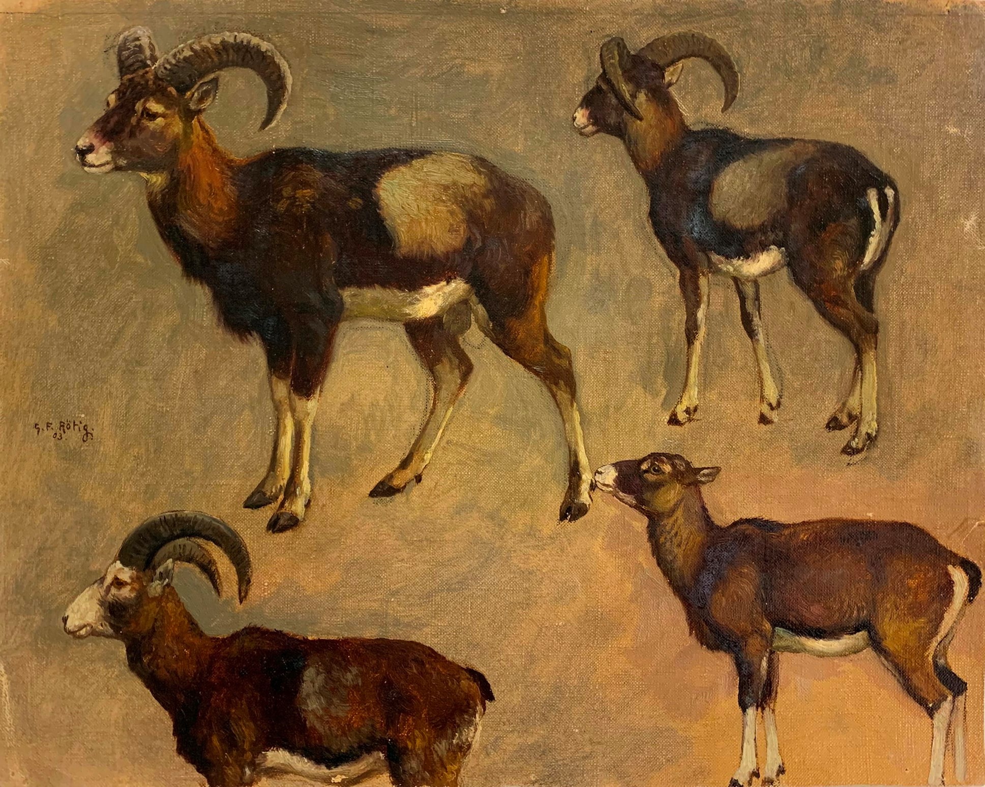 Cette « Etude de mouflons » a été peinte par Georges Frédéric Rotig (1873-1961), un élève de Benjamin Constant et de Jean-Pierre Laurens. Ce peintre animalier est médaillé au Salon des artistes français en 1902 et 1904 et il obtient le prix Rosa Bonheur en 1913. Il s’intéresse tout particulièrement à la chasse et représente le gibier de toutes les parties du monde.
